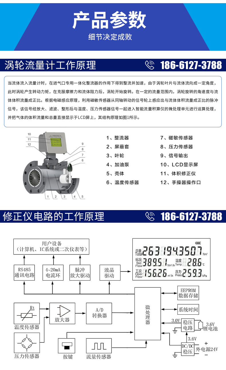 當(dāng)流體流入流量計時,在進(jìn)氣口專用一體化整流器的作用下得到整流并加速,由于渦輪葉片與流體流向成一定角度此時渦輪產(chǎn)生轉(zhuǎn)動力矩,在克服摩擦力和流體阻力后,渦輪開始旋轉(zhuǎn)。在一定的流量范圍內(nèi),渦輪旋轉(zhuǎn)的角速度與流體體積流量成正比。根據(jù)電磁感應(yīng)原理,利用磁敏傳感器從同軸轉(zhuǎn)動的信號輪上感應(yīng)出與流體體積流量成正比的脈沖信號,該信號經(jīng)放大、濾波、整形后與溫度、壓力傳感器信號一起進(jìn)入智能流量積算儀的微處理單元進(jìn)行運(yùn)算處理并把氣體的體積流量和總量直接顯示于LCD屏上,其結(jié)構(gòu)原理如上圖所示